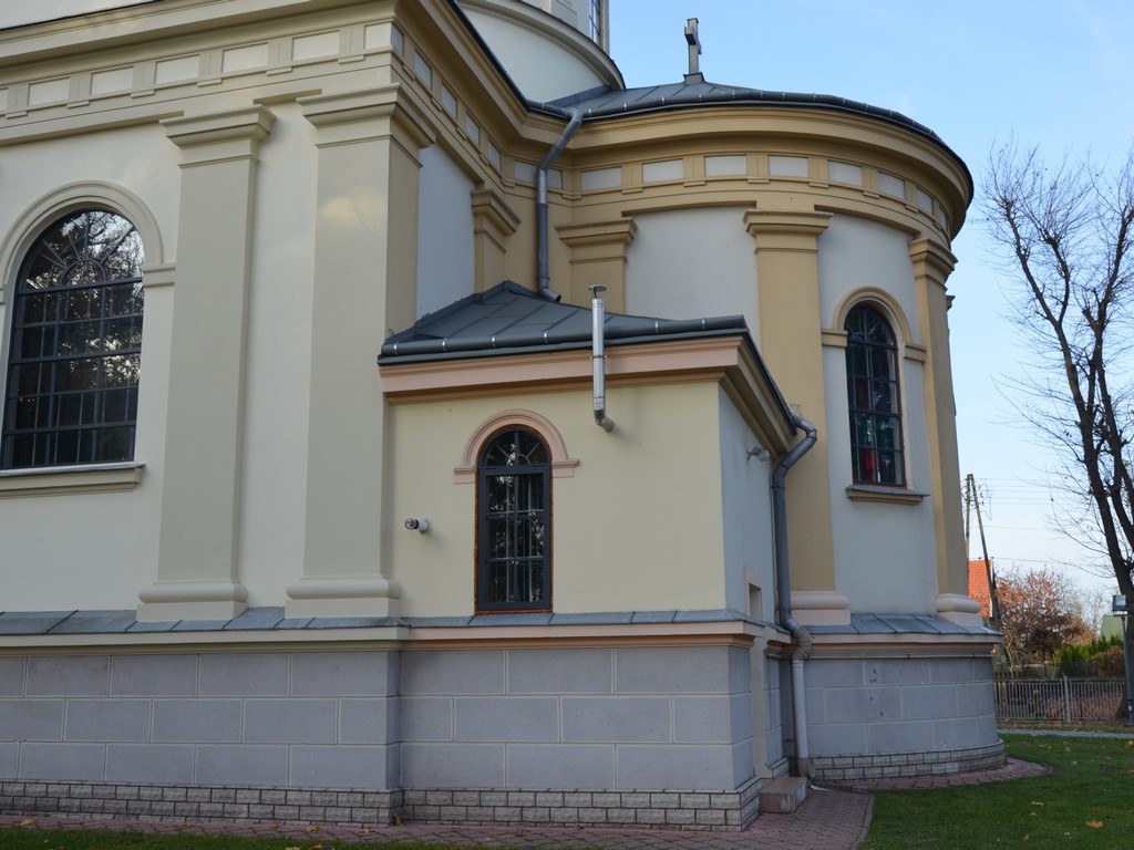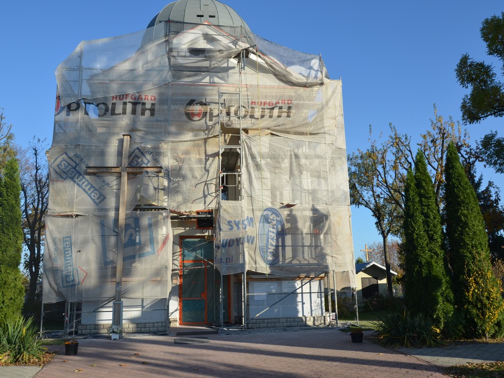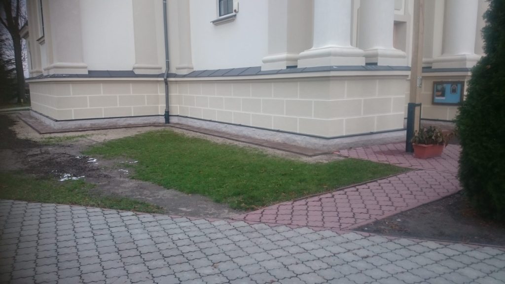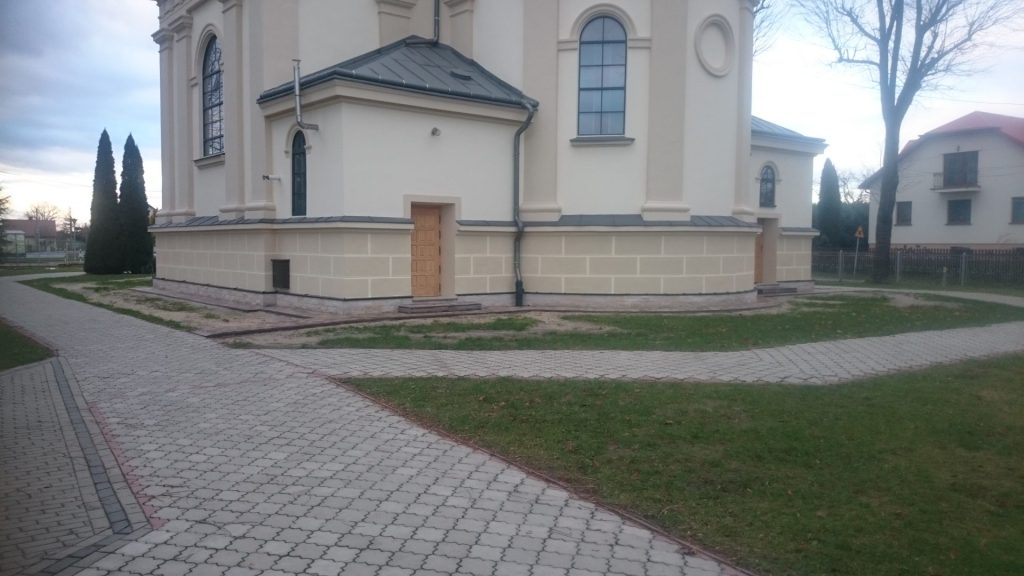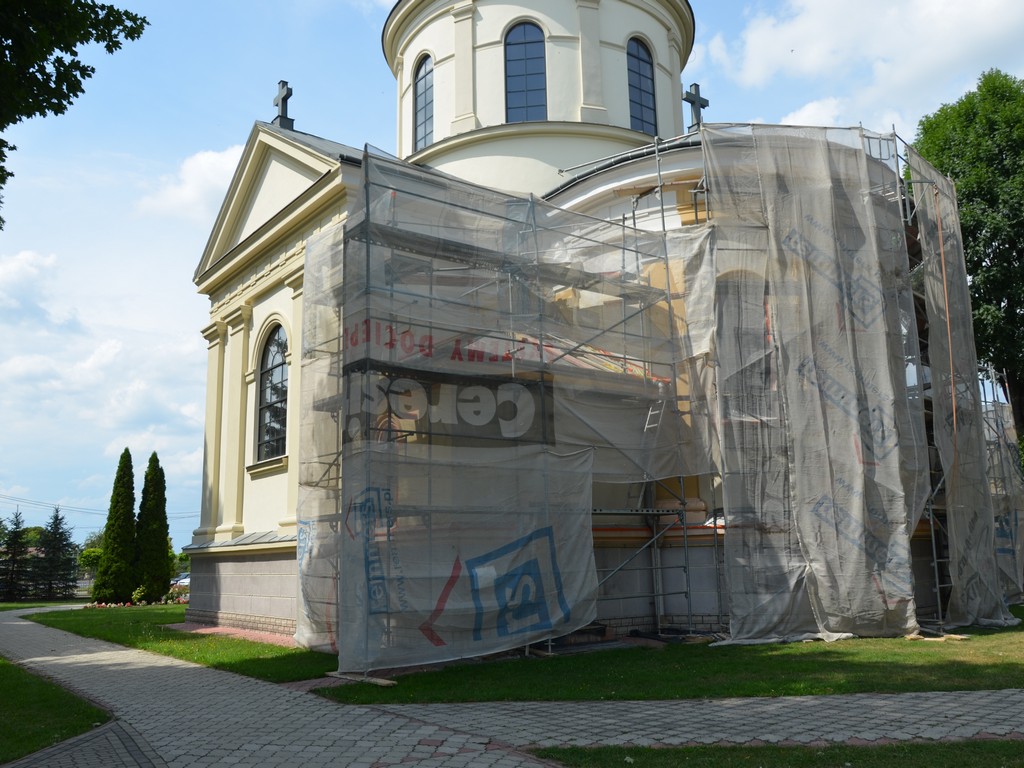 Krótki opis zadania: prace remontowe przy cokole kościoła obejmujące remont gzymsu, remont wyprawy elewacyjnej (bonii) oraz wykonanie w dolnej partii cokołu okładziny z kamienia naturalnego